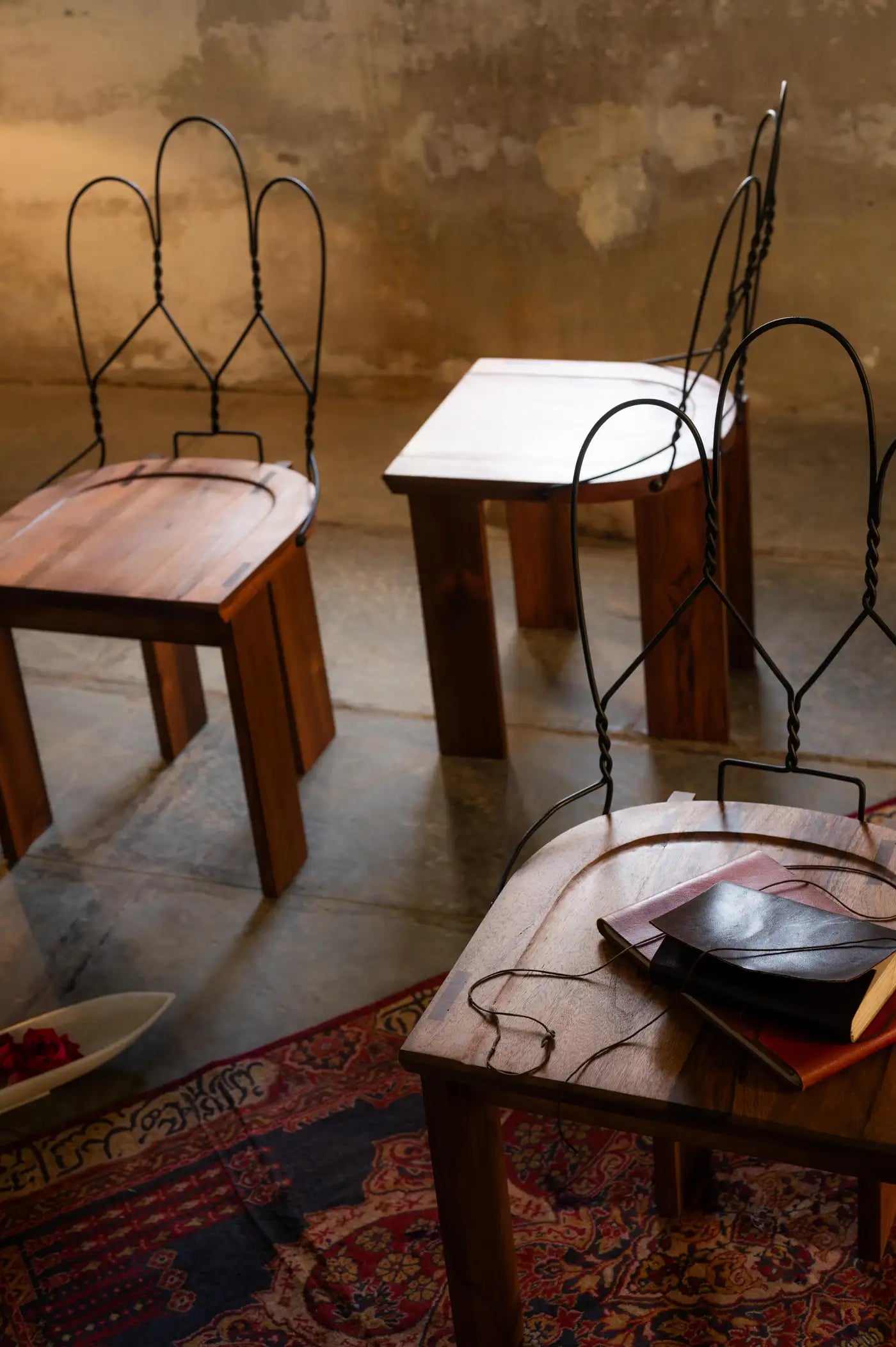The Akar chair is based on the traditional French cafe chair with a twist. The flexible backrest is deceivingly comfortable. The solid reclaimed teak base gives the chair a more stolid presence- a perfect chair for dining, or simply to have a seat.
