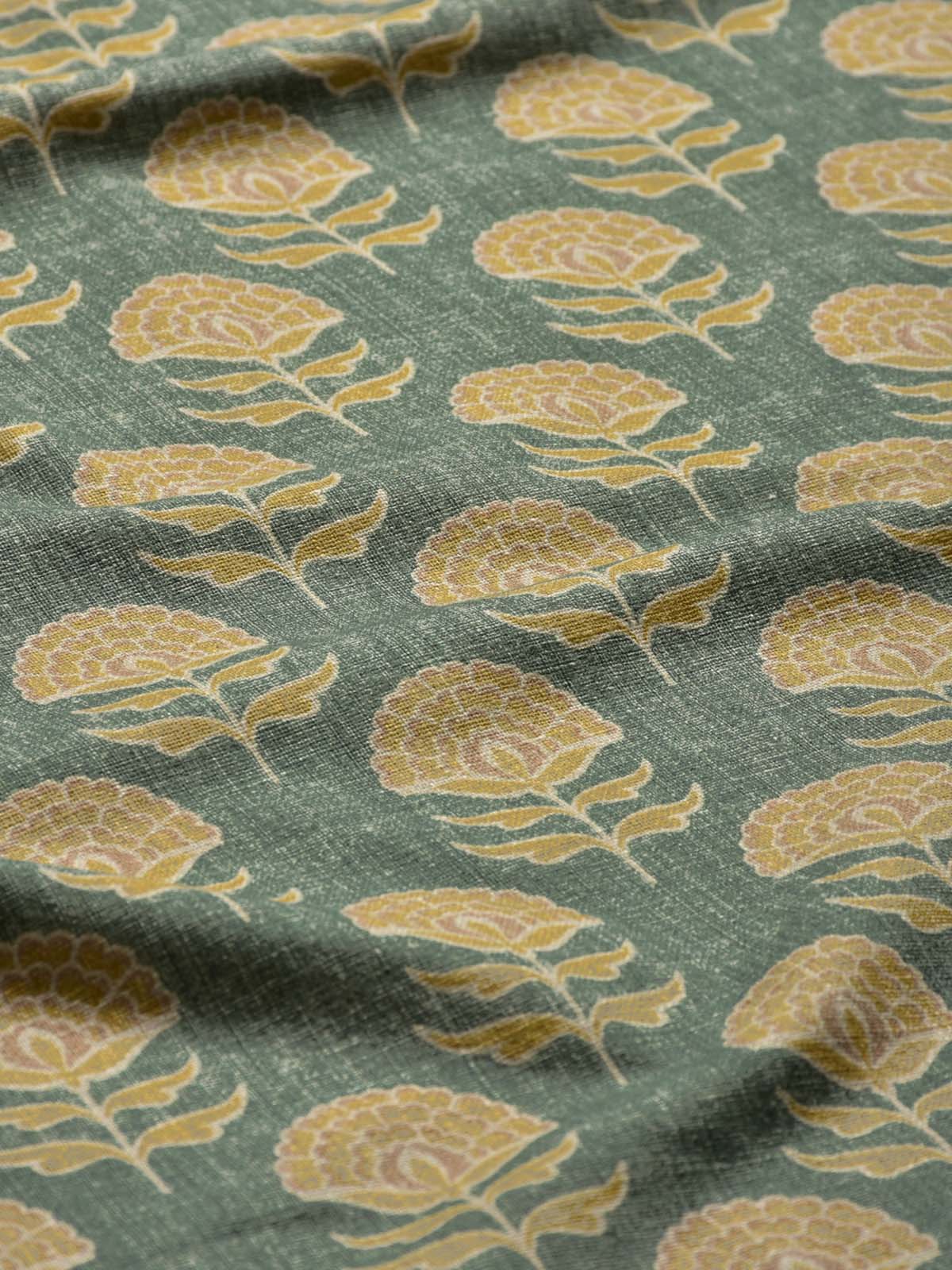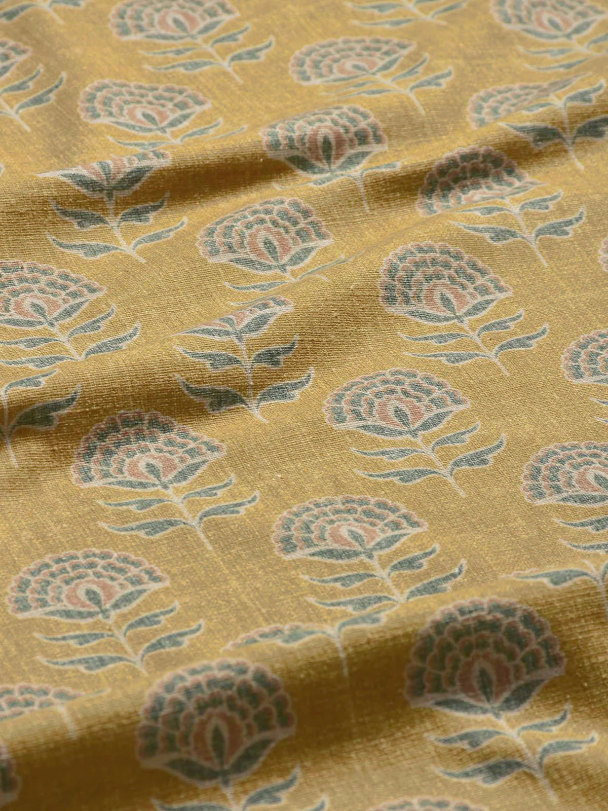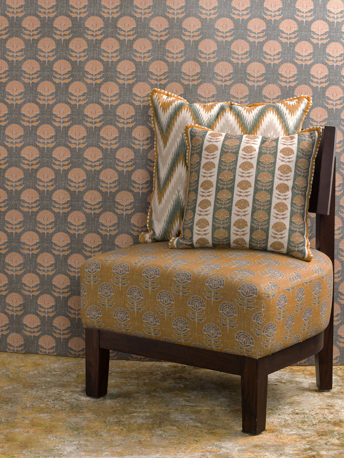 The Amer Phool features a repetition of the quaint and classic Marigold flower in a grey and mustard colour palette. The delicate floral motif makes it the perfect fabric to dress up your indoor and outdoor furniture. The Amer Phool fabric is suitable for curtains, blinds and furniture upholstery.