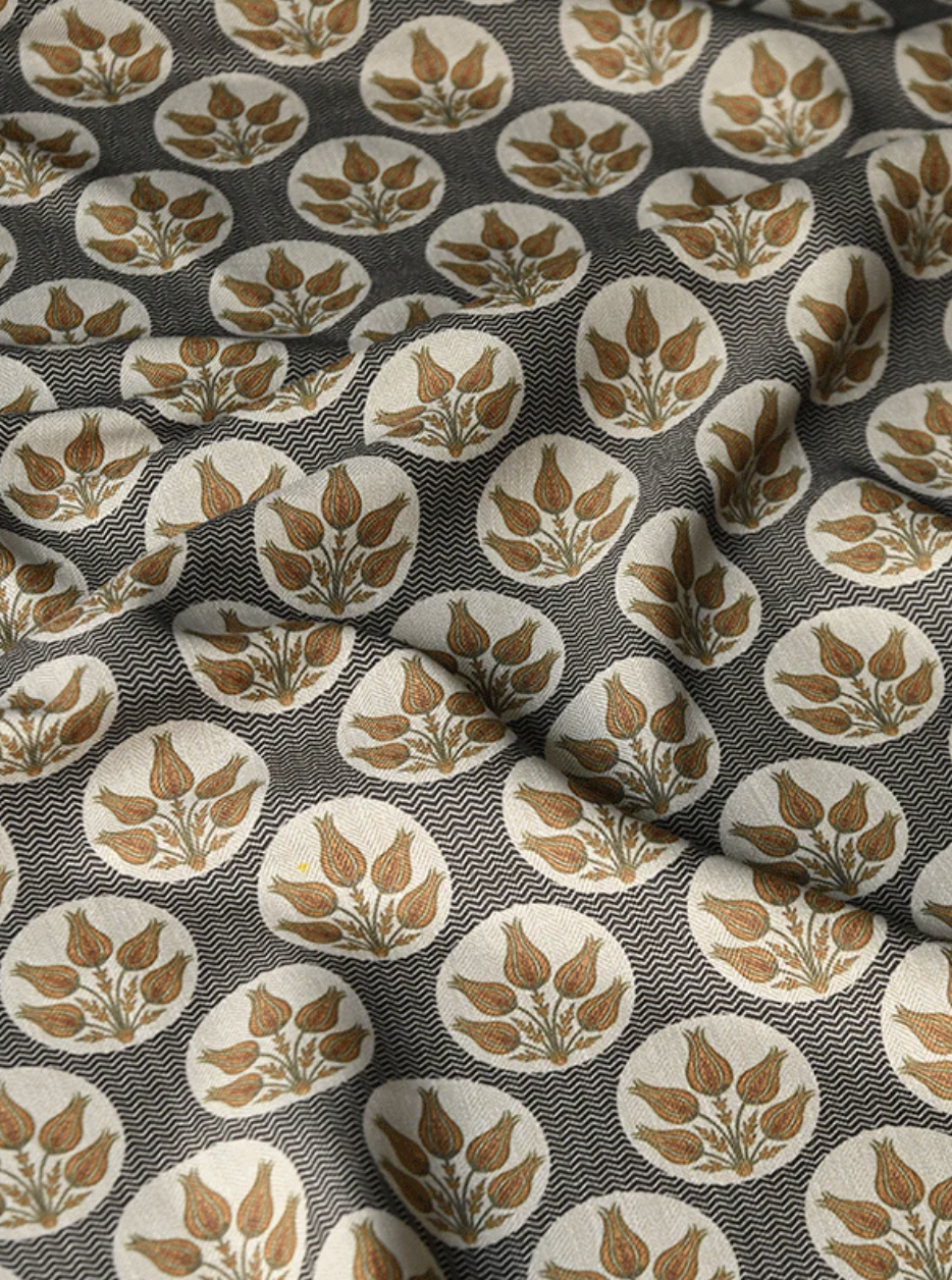 The Eden fabric blends delicate tulip florals with a bold chevron pattern. In rich mustard and olive tones on a deep charcoal base, it adds color and depth to any space. Perfect for curtains, blinds, and furniture upholstery, this statement fabric brings timeless elegance to your home.