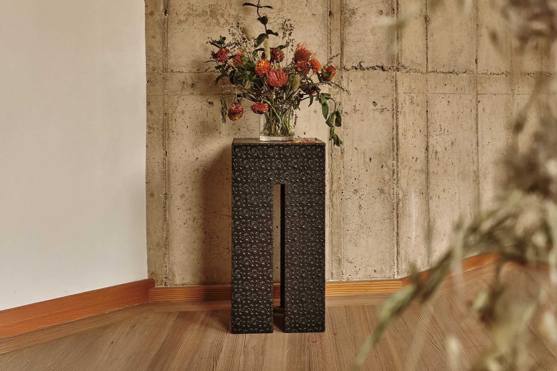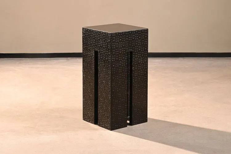 A striking balance of function and ornament, the Z Table is a sculptural statement with intricate embossed metal detailing. Clad in custom patterns and finished in blackened brass, sits tall, rectangular form will elevate every space.
