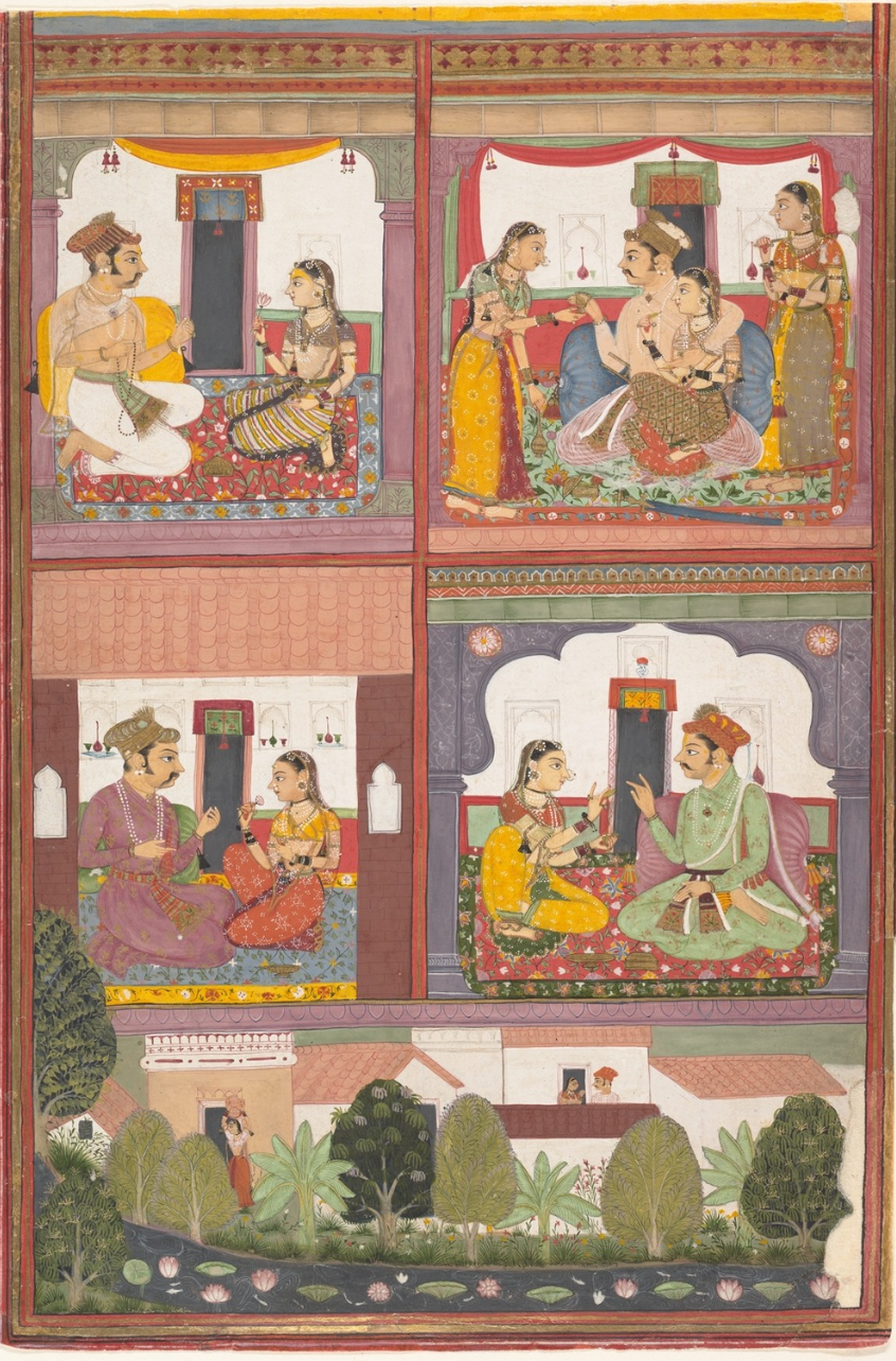 This vivid Mughal miniature captures love in its many moods — tender, playful, and contemplative. Within each chamber, a couple exchanges glances, gestures, and words that reveal the evolving dance of devotion. Together, they tell a timeless story of ishq — passion that is at once divine and deeply human.