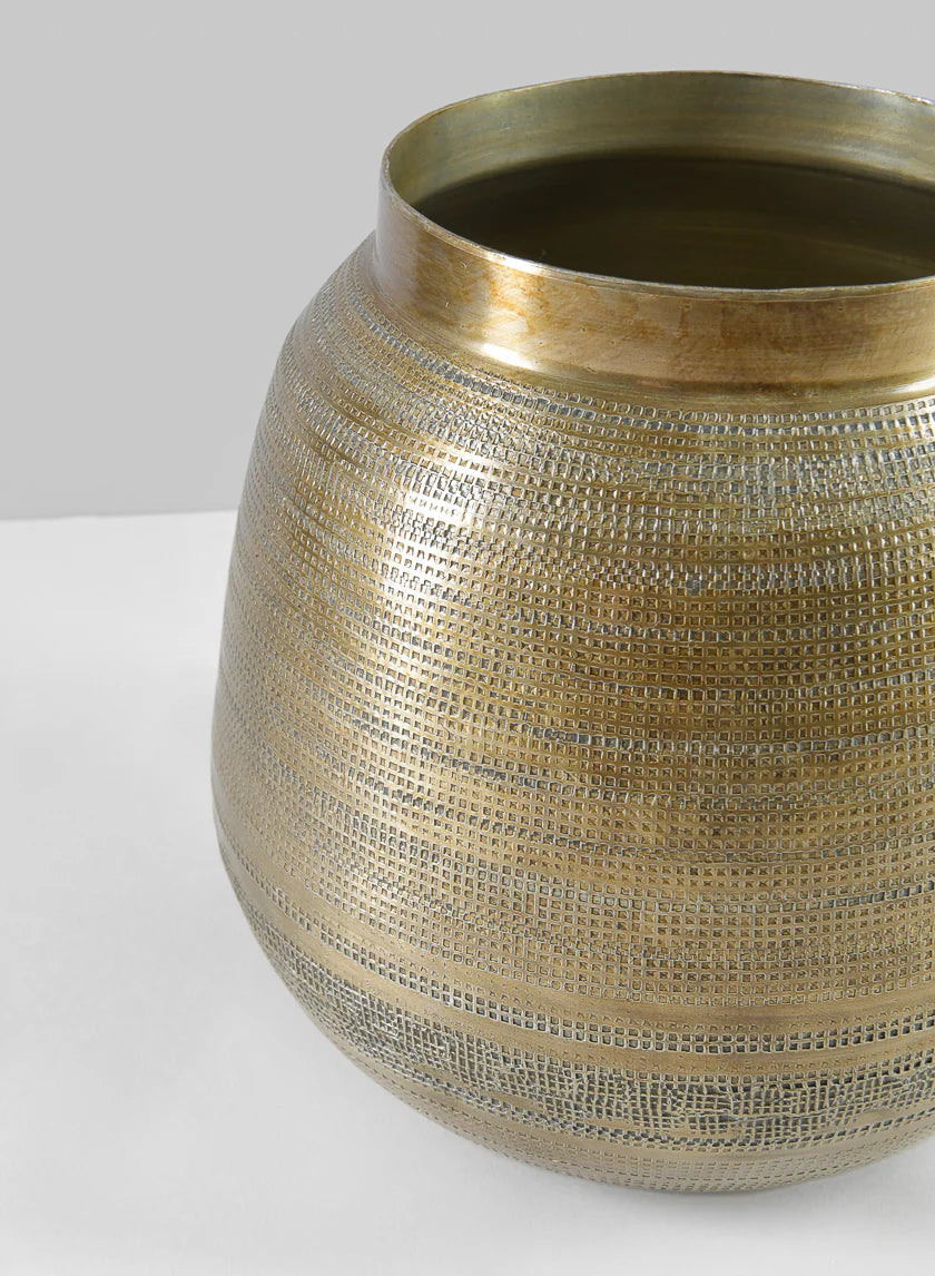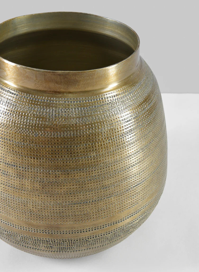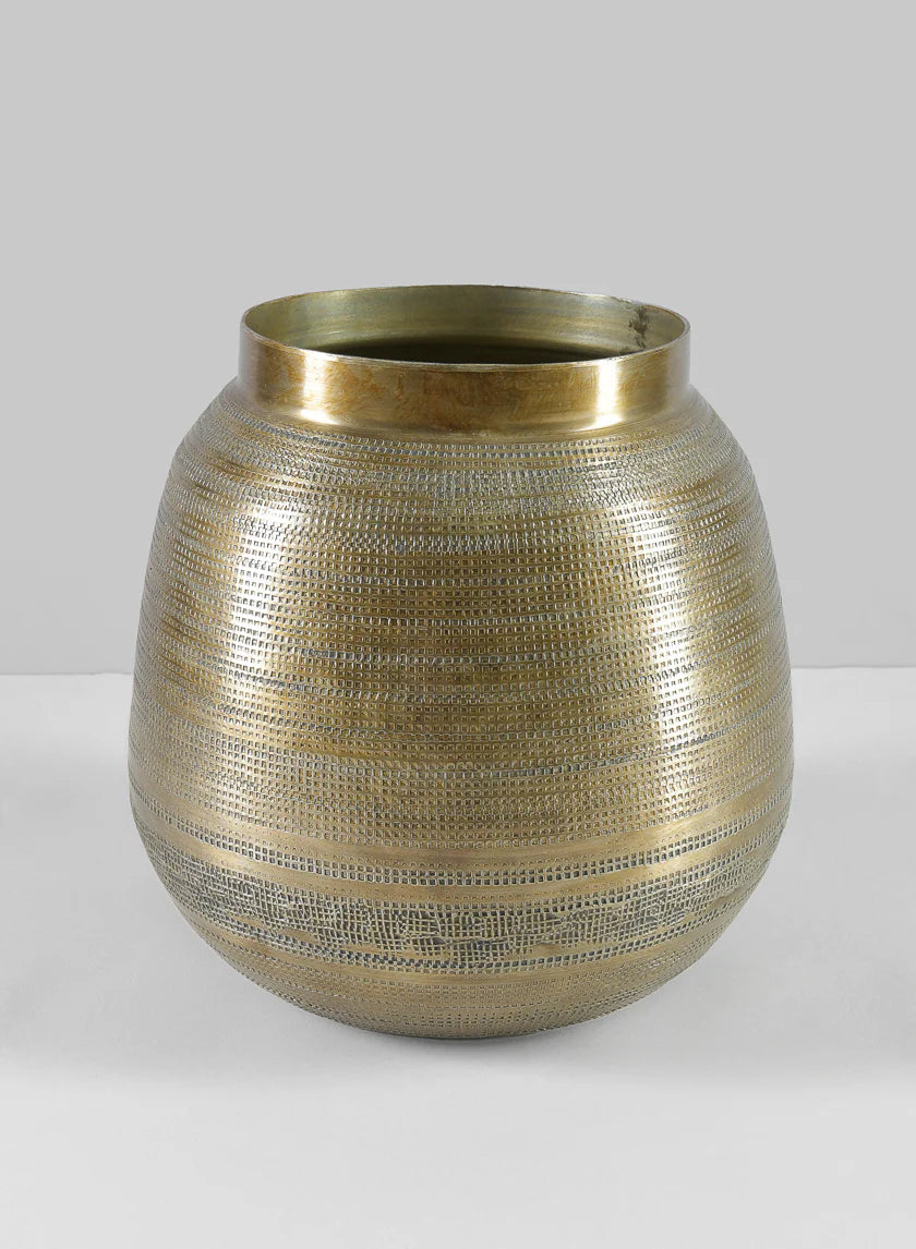 The Mehr Vase blends traditional Indian craftsmanship with timeless design. Its hand-etched brass finish and rounded silhouette bring warmth and texture to consoles, shelves, or coffee tables. Best suited for indoor styling.